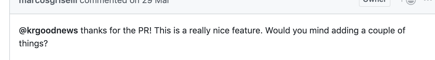 “This is a really nice feature”에서 저는 소름이 돋았습니다. 온라인에서 누군가에게 기능을 제안하고, 그걸 리뷰받은 적이 처음이라 ‘거절하면 어쩔 수 없지’라는 마음으로 리뷰를 요청했는데 칭찬을 받았으니까요. 저때는 정말로 컴퓨터 앞에서 춤을 췄습니다. 칭찬은 개발자도 춤추게 하더군요. 저는 메인테이너가 원하는대로 Readme에 설명을 추가하고 해당 기능의 테스트코드도 작성하였습니다. 이때는 개발을 하면서 일종의 희열을 느꼈던 것으로 기억합니다. 저의 풀리퀘가 master 브랜치에 올라가고 버전업이 될때는 마치 위대한 개발자가 된 듯 한 착각에 이르기도 했습니다.